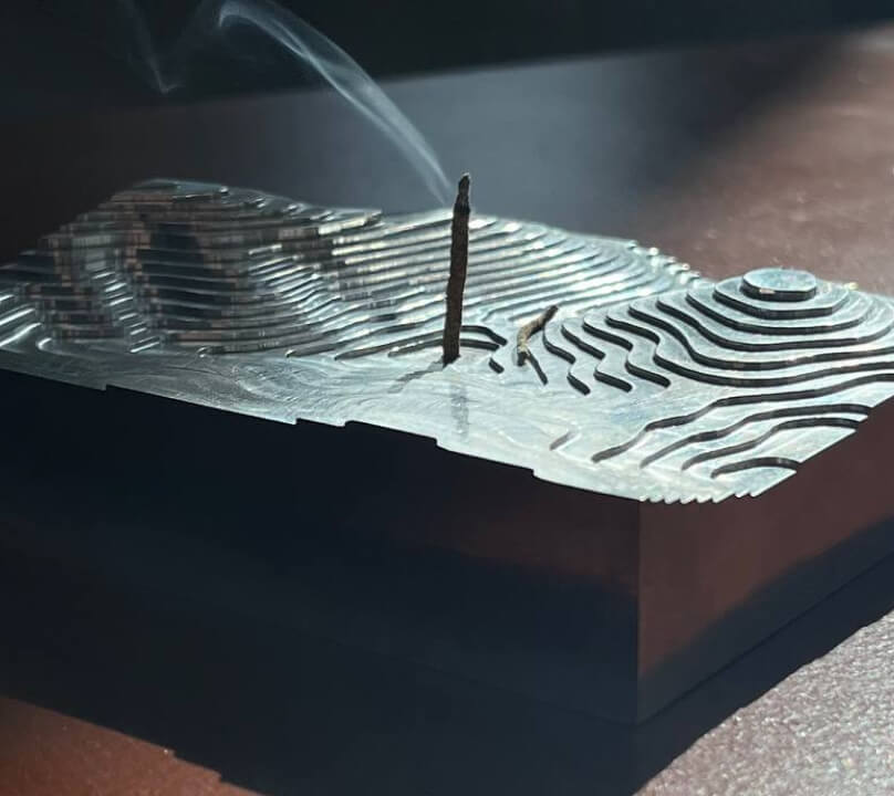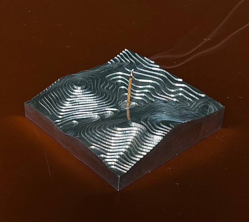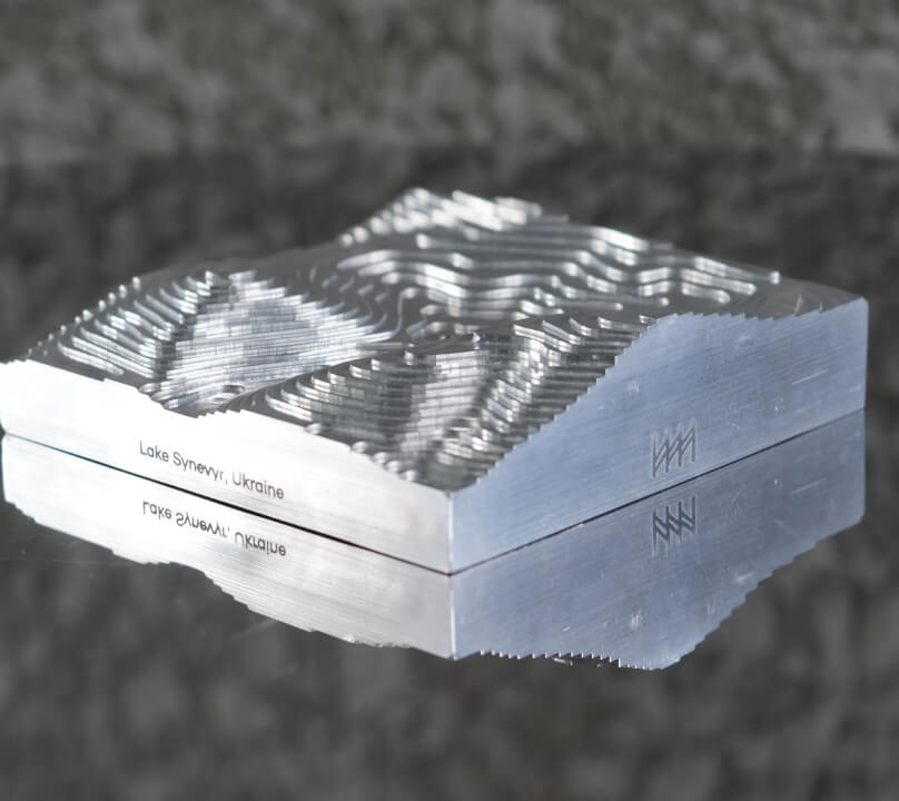 Нашим завданням було виготовити підставку під пахощі у вигляді топографічної карти району довкола озера Синевир – саме таким був задум замовника. Ми зробили три прототипи: з дерева, кераміки та алюмінію. Зазвичай, перед початком виробництва ми виготовляємо прототипи – можемо робити їх з різних матеріалів.